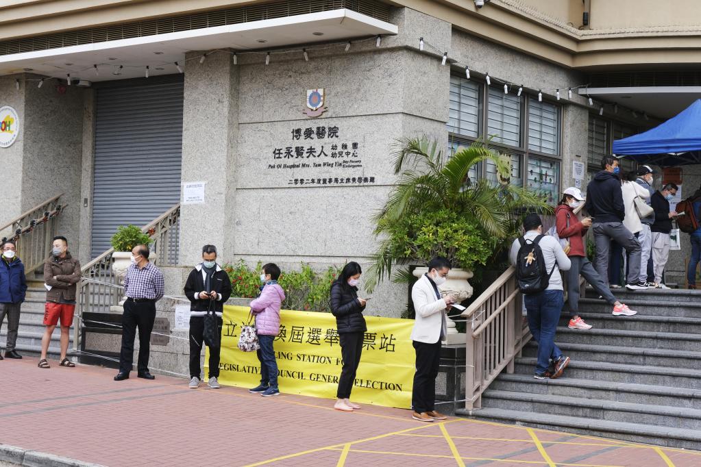 19日的香港出現降溫。據記者觀察,很多市民仍一早即來投票,部分投票站外排起長龍。