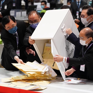 12月19日,香港特區選舉管理委員會主席馮驊(右二)打開票箱。新華社記者 呂小煒 攝