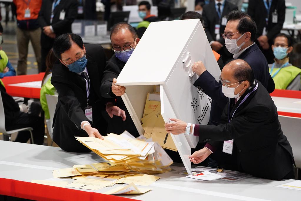 12月19日,香港特區選舉管理委員會主席馮驊(右二)打開票箱。香港特別行政區第七屆立法會選舉投票于19日約23時順利結束。這是完善選舉制度后香港特區舉行的首次立法會選舉。新華社記者 呂小煒攝