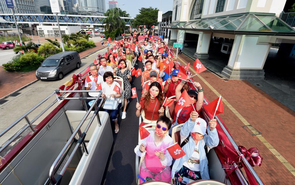 10月1日,在香港街頭,參加慶祝國慶巴士巡游的人們揮動國旗和香港特區區旗。新華社記者 盧炳輝 攝