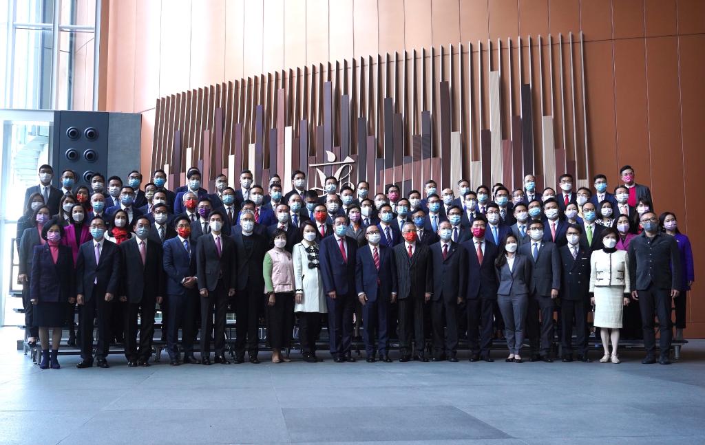 1月3日11時許,香港特區第七屆立法會90位議員開始宣誓。議員在儀式后合影。新華社記者 呂小煒 攝