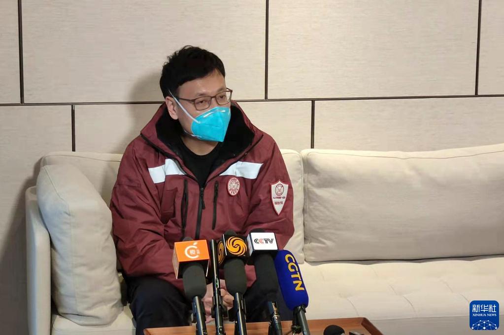 2月21日,第二批內地援港抗疫醫療防疫工作隊核酸采樣負責人、中山大學附屬第一醫院副院長張弩在香港接受采訪,介紹醫療隊核酸采樣人員首日工作情況。新華社記者 查文曄 攝