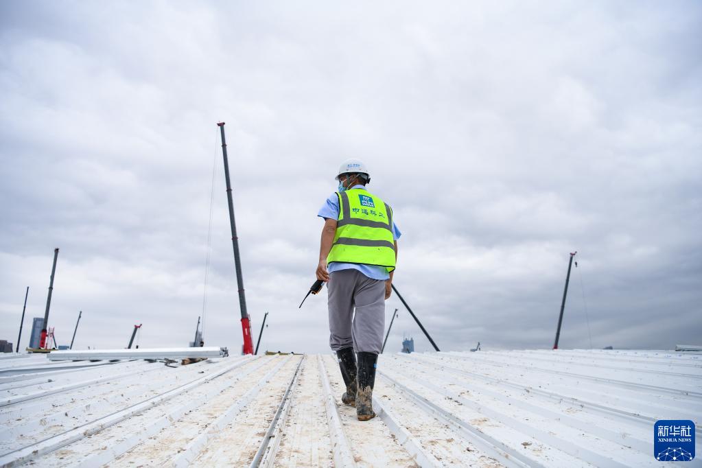 3月27日,一期醫院A1工區長李增源在屋頂上察看施工情況。新華社記者 梁旭 攝