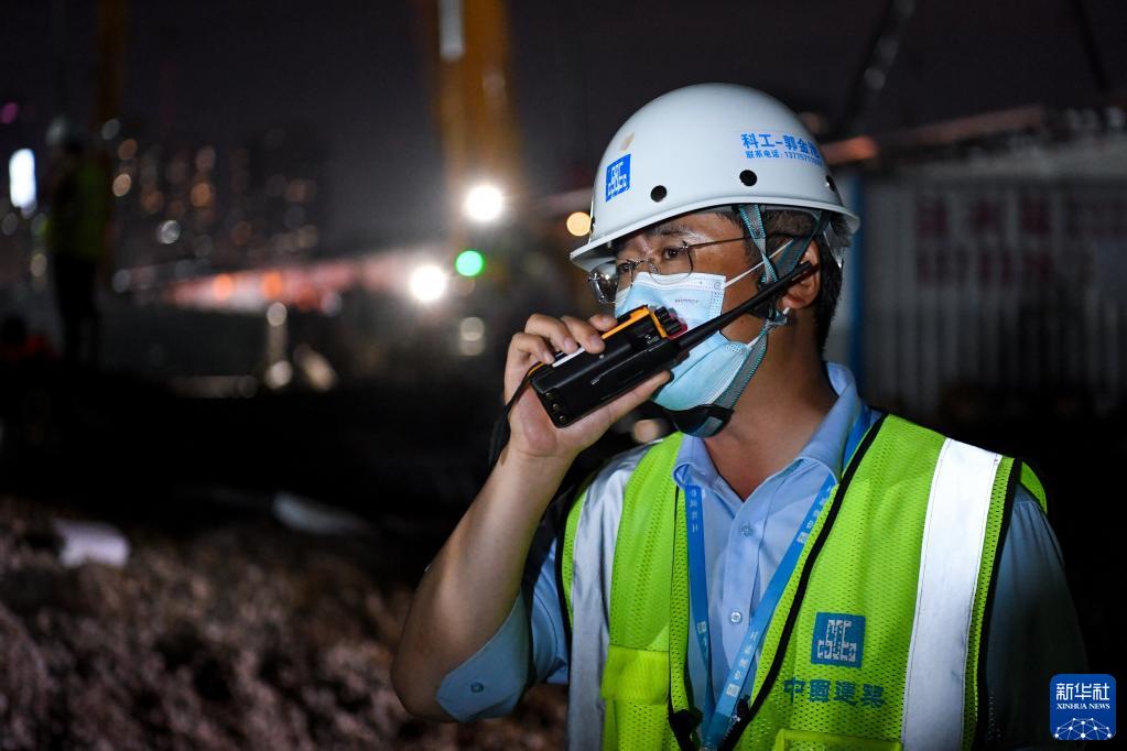 3月30日晚,一期醫院A2工區長郭金池在施工現場用對講機溝通。新華社記者 梁旭 攝