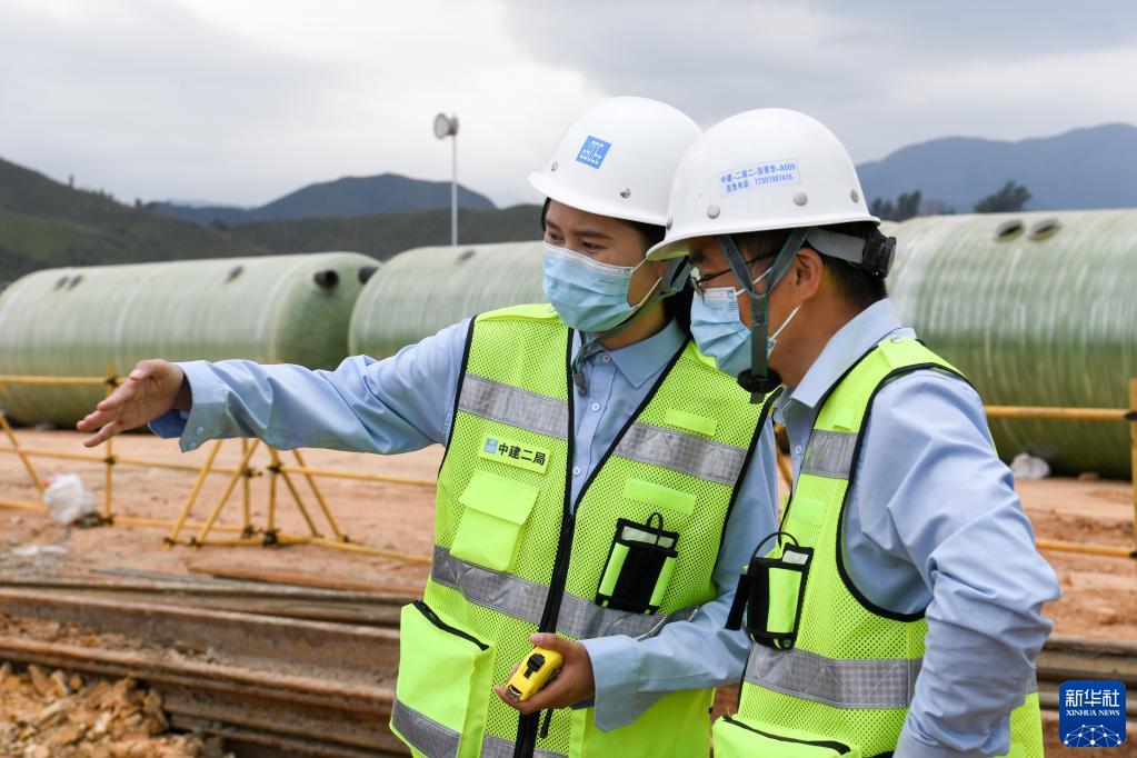 3月16日,呂夢圓(左)和總工程師張青華在化糞池施工現場討論方案。新華社記者 梁旭 攝