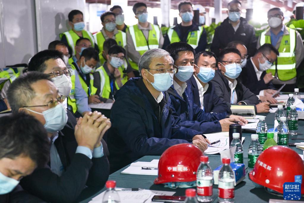 3月7日晚,中建科工集團有限公司董事長王宏(中)在應急醫院項目現場了解各工區施工進度。新華社記者 梁旭 攝