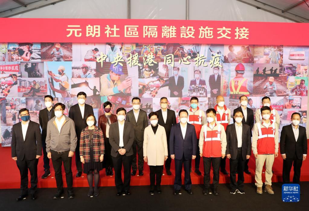 3月24日,香港特區行政長官林鄭月娥(前左五)等出席元朗社區隔離設施交接儀式。新華社記者 李鋼 攝