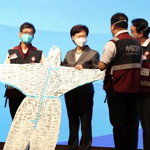 5月5日,內地援港醫療隊向香港特區行政長官林鄭月娥(左三)贈送簽名防護衣。新華社記者 李鋼 攝