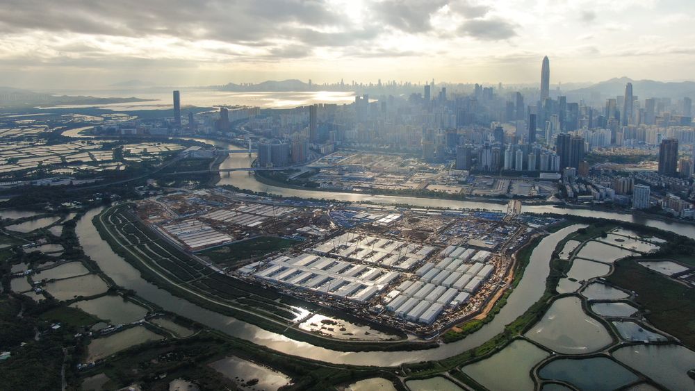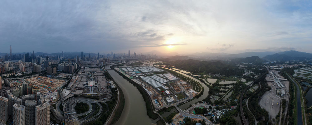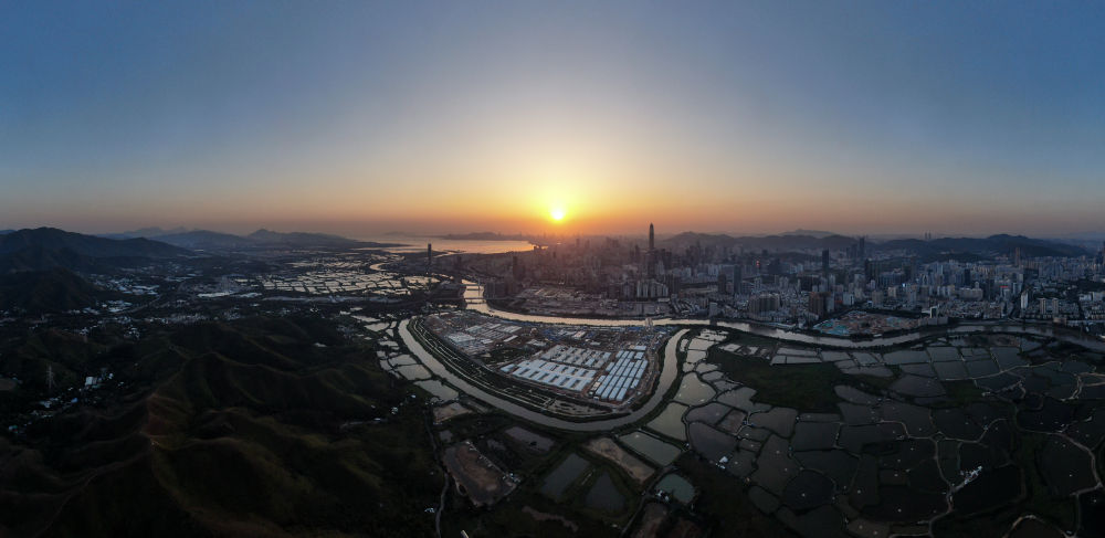 4月3日,夕陽下的落馬洲河套地區,中央援港應急醫院如一葉方舟。