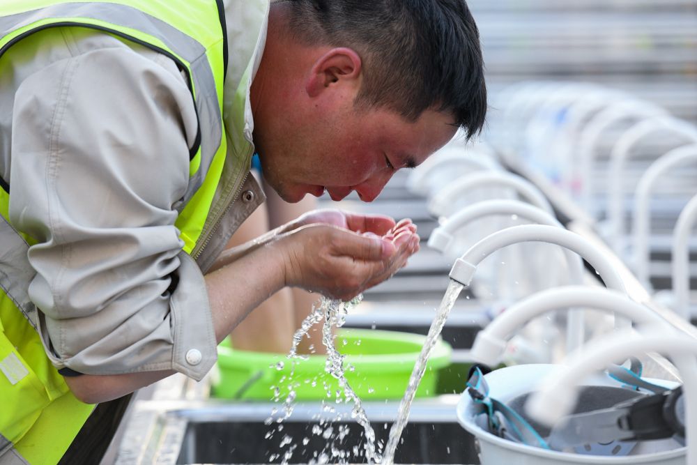 3月9日,臨時用水接通。這是一名建設者用涼水給曬紅的臉降溫。