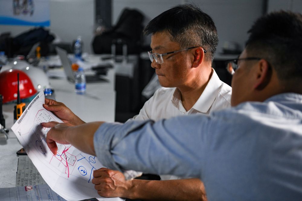 這是中建科工分管生產的副總經理方春生(左),烈日在他臉上曬出口罩的痕跡(3月10日攝)。