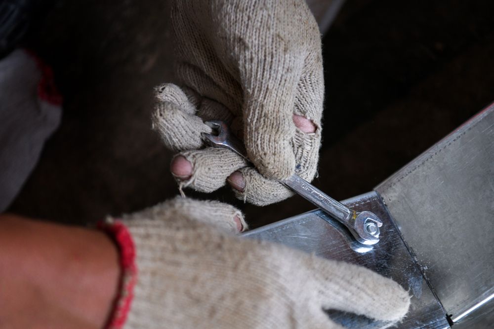 3月27日,工人正在擰緊一顆螺絲,戴著的一雙勞保手套上有多處破洞。