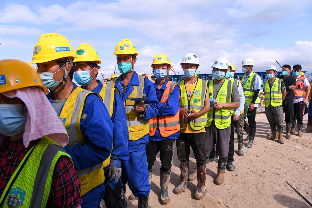 轉而連降暴雨,氣溫急轉直下,雨水和黃土和成泥漿灌進工人生活區的帳篷,行軍床和被褥漂在泥水里,但為了搶工期,建設者們仍在雨中夜以繼日奮戰。