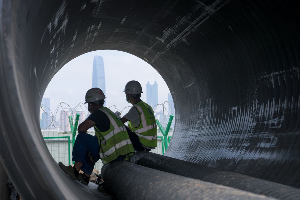 3月21日中午,兩名建設者坐在管道里短暫午休。