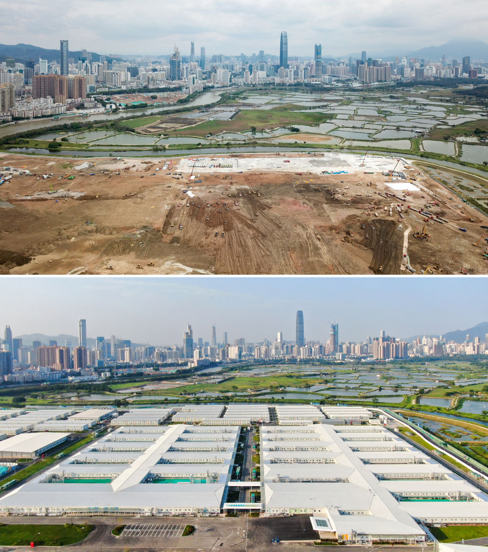 這是中央援港應急醫院建設中、完工后對比照片(上圖拍攝于3月7日,下圖拍攝于5月4日)。