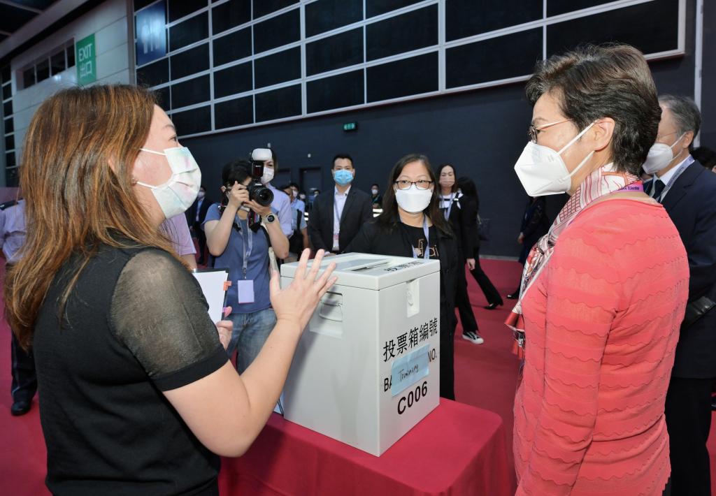 5月7日,香港特區行政長官林鄭月娥視察位于香港會議展覽中心的行政長官選舉主投票站及中央點票站。新華社發
