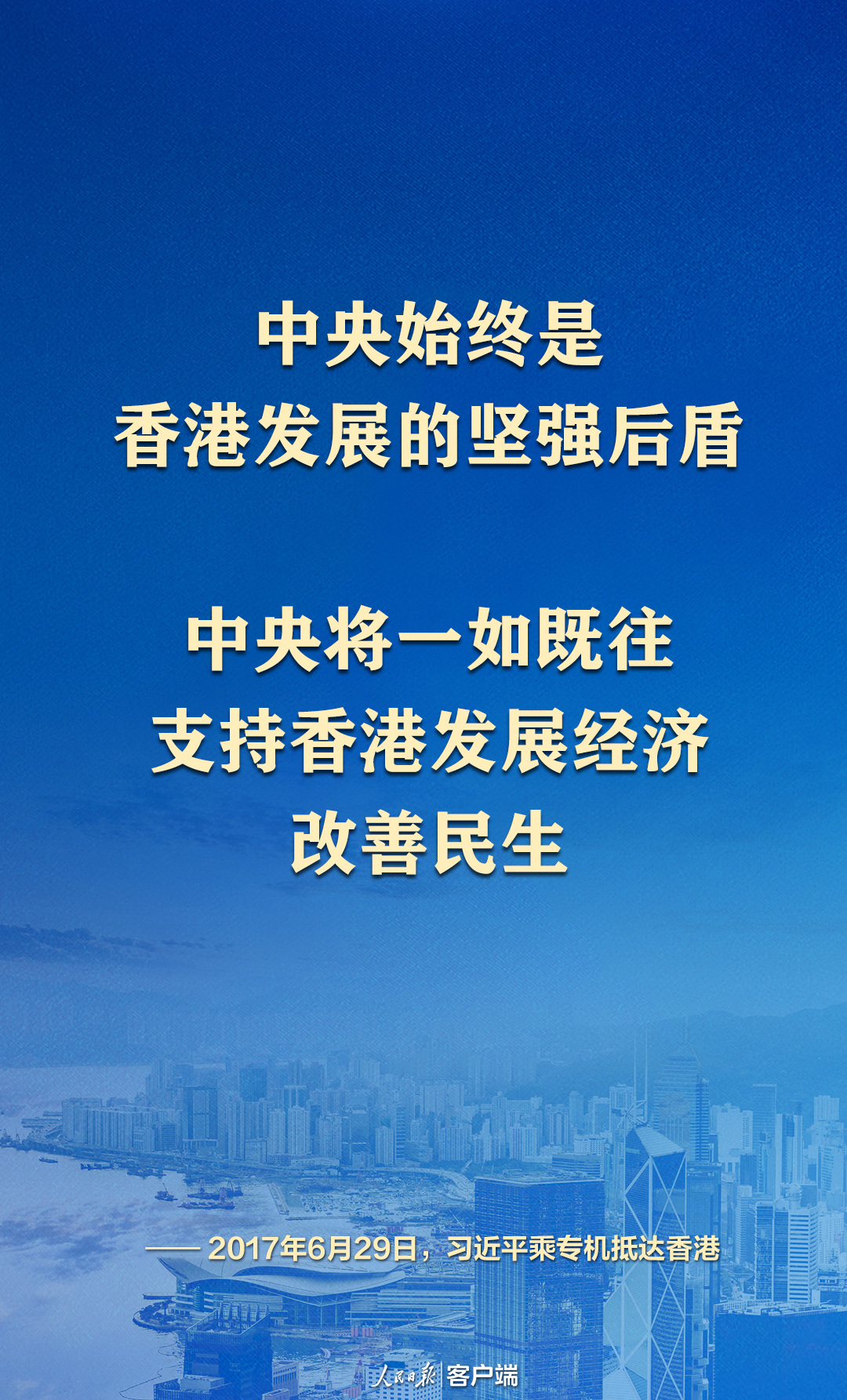 “中央始終是香港發展的堅強后盾。中央將一如既往支持香港發展經濟、改善民生”。2017年6月,習近平主席時隔9年再度踏上香港。同年,黨的十九大報告提出要支持香港“融入國家發展大局”。