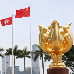 麗日晴空下,金紫荊廣場,鮮艷的五星紅旗迎風招展,隆重熱烈的喜慶氛圍洋溢在維港兩岸。