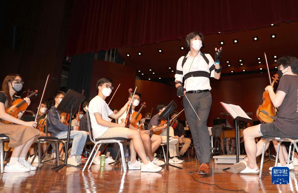 在彩排中,香港浸會大學交響樂團音樂總監潘明倫身上多處綁著傳感器,他不時與臺下的技術團隊進行溝通(7月11日攝)。新華社記者 吳曉初 攝