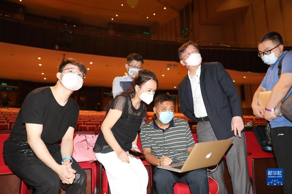 人工智能專家、浸會大學副校長郭毅可(右二)在彩排現場(7月11日攝)。新華社記者 吳曉初 攝