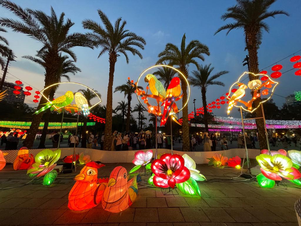 夜幕降臨,香港維多利亞公園的大型燈飾逐漸亮起。高7米的中式帆船造型彩燈,還有鸚鵡、駿馬、鯉魚等多組不同主題彩燈,璀璨奪目。