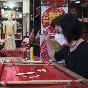 走進老店位于九龍街頭的店鋪,宛如走進一個小型婚慶用品博物館。衣架上掛著各式新娘裙褂、新郎馬褂、旗袍等,櫥窗里有繡花鞋、龍鳳掛件、新娘傘等配飾,還有枕頭、坐墊等婚嫁用品陳列,墻上貼著大紅的喜字。