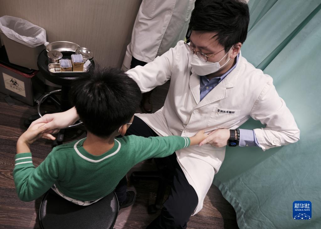 12月16日,在香港浸會大學北角中醫??圃\所,中醫師張振海(右)為一名小朋友推拿診療。新華社記者 王申 攝