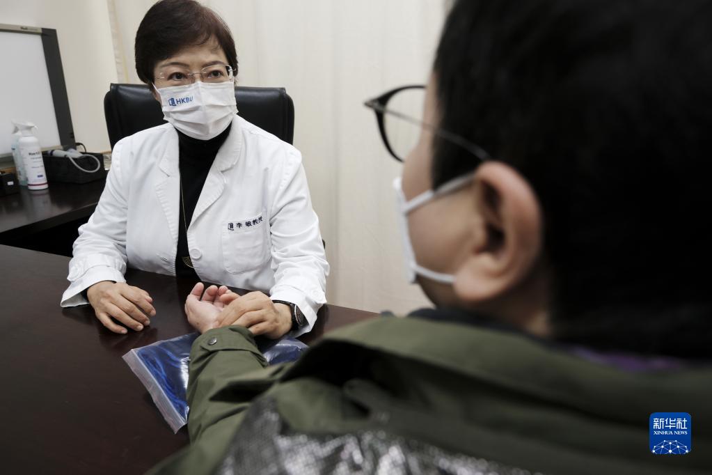 12月13日,在香港浸會大學陳漢賢伉儷中醫??圃\所暨臨床規范研究中心,中醫藥學院副院長李敏(左)在為病患把脈。新華社記者 王申 攝