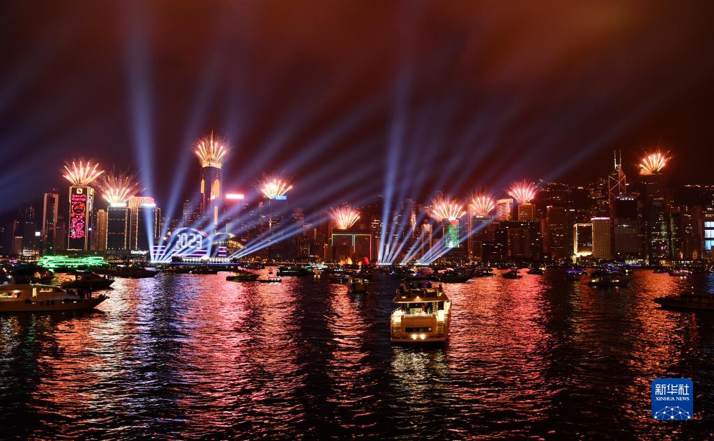 1月1日,香港維多利亞港上演“幻彩詠香江”加強版煙火光影匯演,迎接2023年的到來。新華社記者 陳鐸 攝