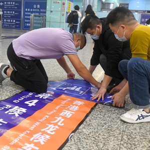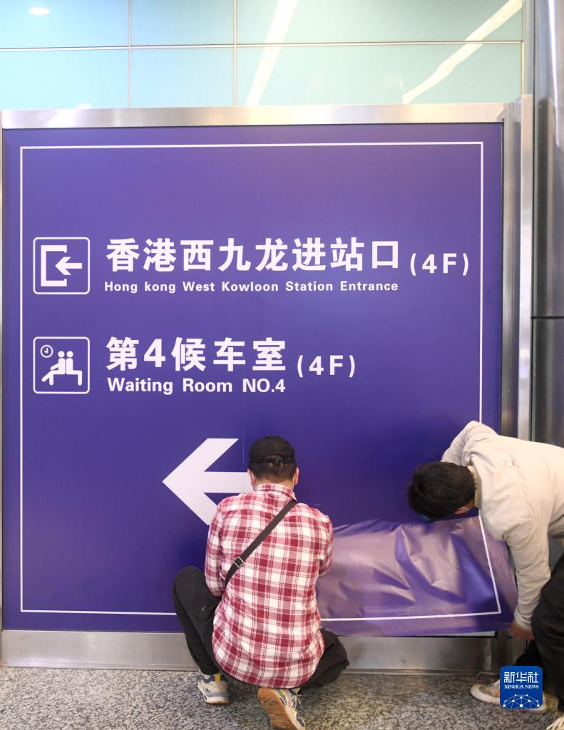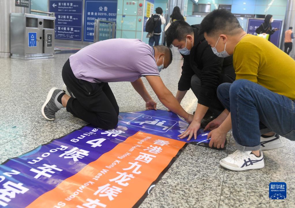 1月12日,工作人員在廣州東站張貼廣深港高鐵候車室指引標識。新華社記者 盧漢欣 攝