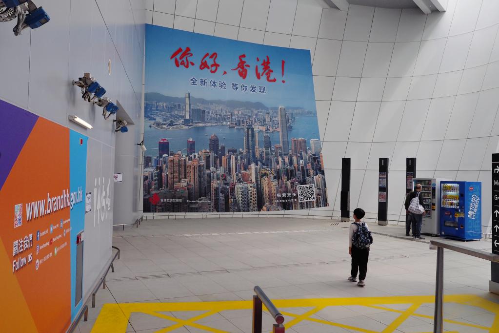 在香港香園圍口岸旅檢大樓,口岸張貼“你好,香港”的大幅廣告歡迎來到香港的旅客。新華社記者 王申 攝