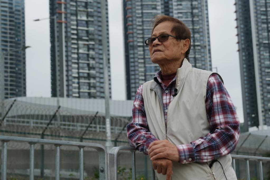在香港香園圍口岸,85歲的萬秀平站在旅檢大樓前,背后的深圳高層居民樓近在眼前。新華社記者 王申 攝