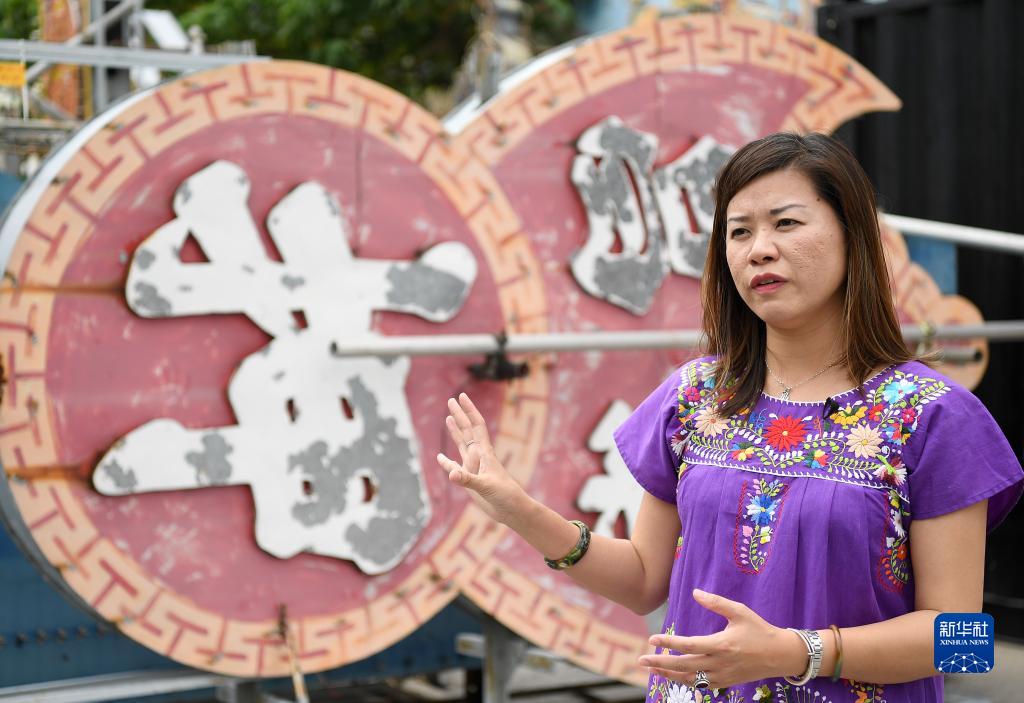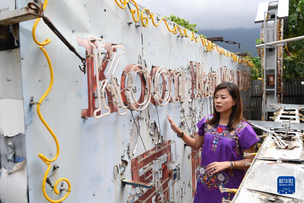霓虹招牌保育工作者陳倩文介紹她收藏保育的霓虹招牌(3月23日攝)。新華社記者 陳鐸 攝