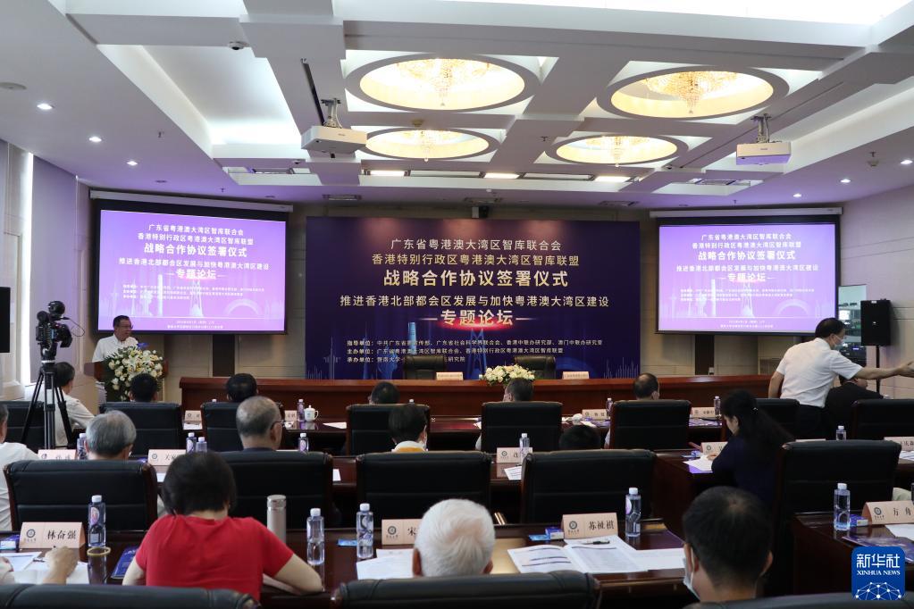 6月1日拍攝的廣東省粵港澳大灣區智庫聯合會與香港特別行政區粵港澳大灣區智庫聯盟戰略合作協議簽署儀式現場。新華社記者 洪澤華 攝