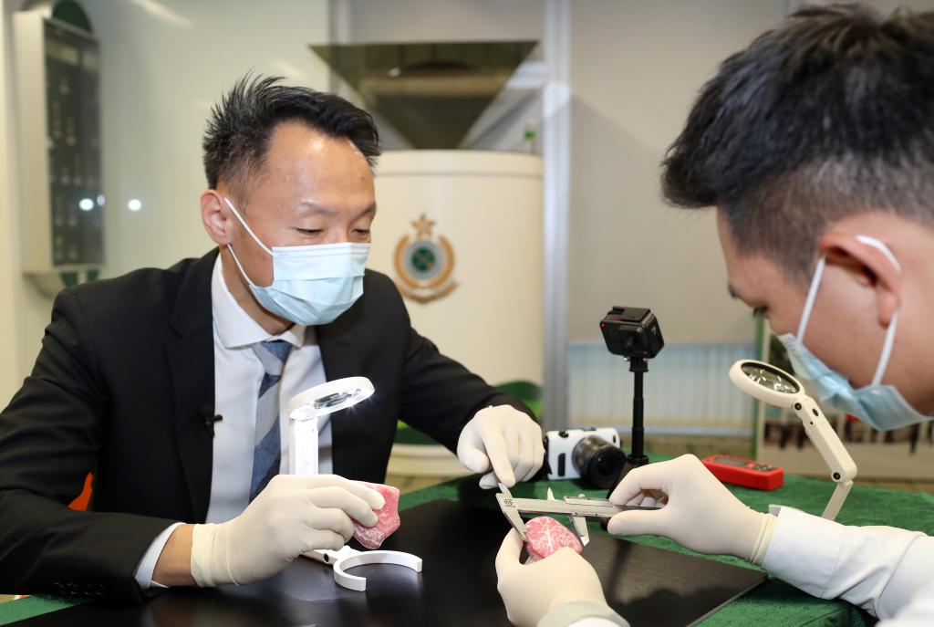 香港海關情報科監督劉玉龍(左)和同事察看玉石(8月18日攝)。新華社記者 李鋼 攝