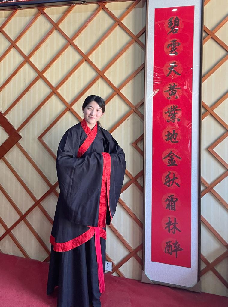 署理高級督察倪百禧試穿漢服(2023年7月攝,資料照片)。新華社發