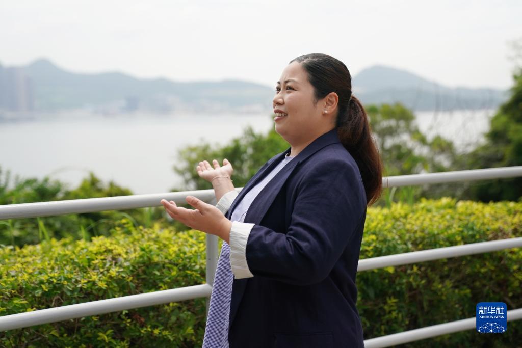 香港海防博物館一級助理館長梁明穎向新華社記者介紹香港海防博物館獨特的地理位置(8月10日攝)。 新華社記者 王申 攝