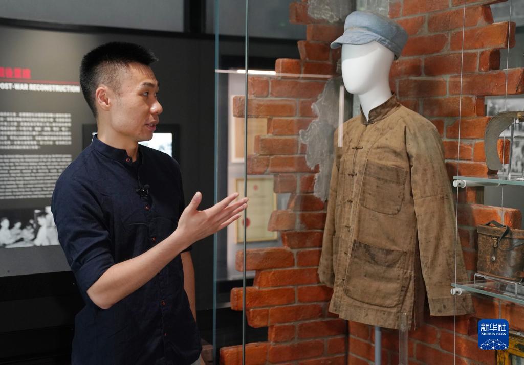 香港海防博物館二級助理館長楊汶翹向新華社記者介紹博物館展廳中東江縱隊港九獨立大隊成員抗戰時的穿戴裝束(8月24日攝)。 新華社記者 王申 攝