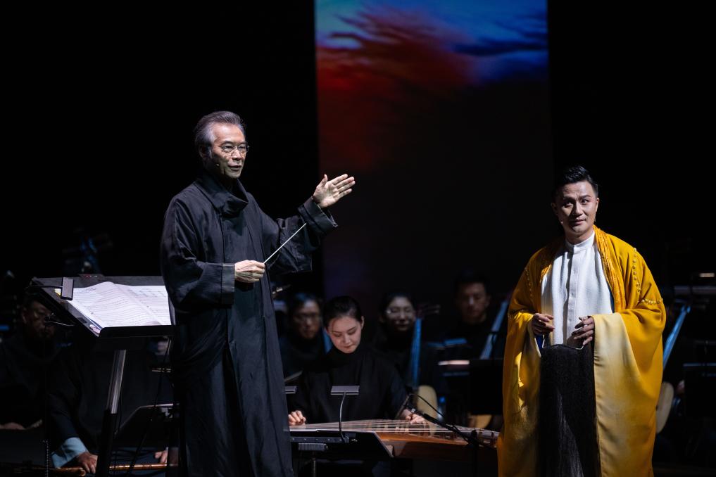 燈光漸暗,音樂未起?!昂靡粋€明月皎潔的夜晚!”站在指揮臺上的藝術總監兼終身指揮閻惠昌朗聲說道。這是他的第一句臺詞,也是全劇的開場。在這場由內地、香港和臺灣三地藝術家共同出演的昆曲與民樂的音樂對話中,他既是真正的指揮,也扮演了其中的“指揮”角色。
