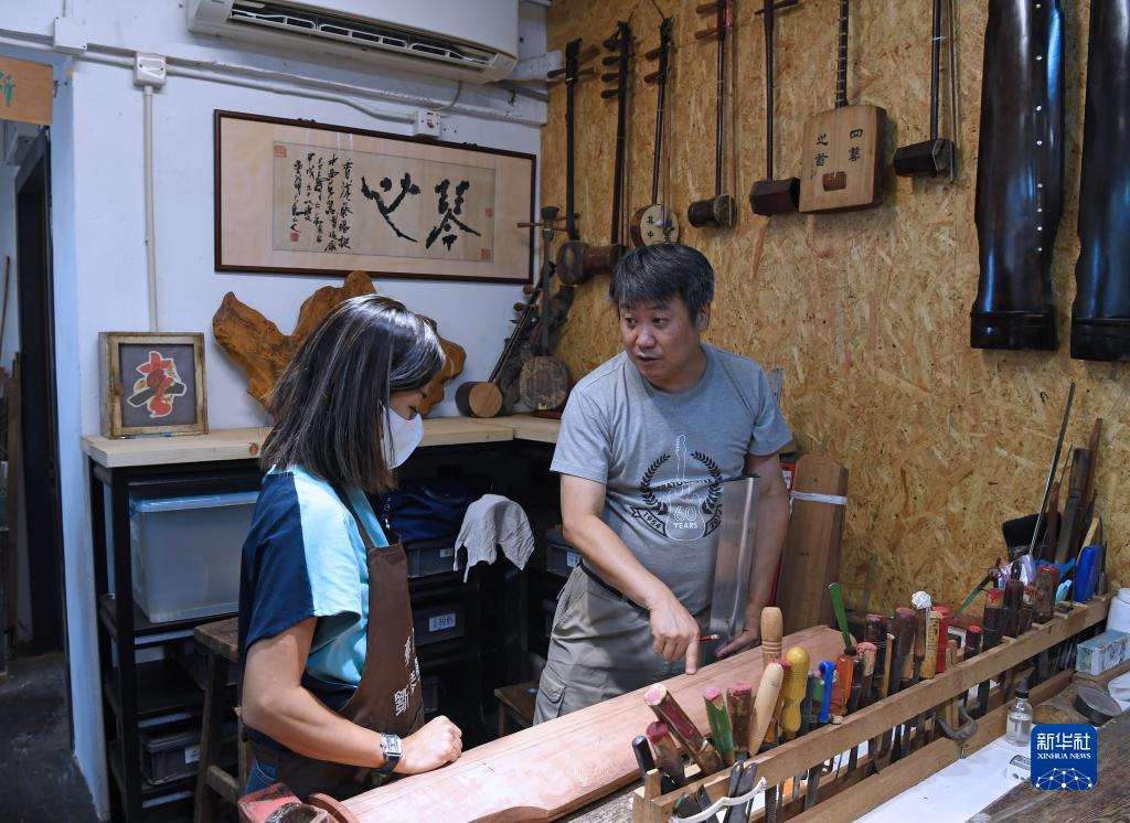 10月7日,徒弟黃良喜(右)在指導師妹制作古琴。 新華社記者 陳鐸 攝