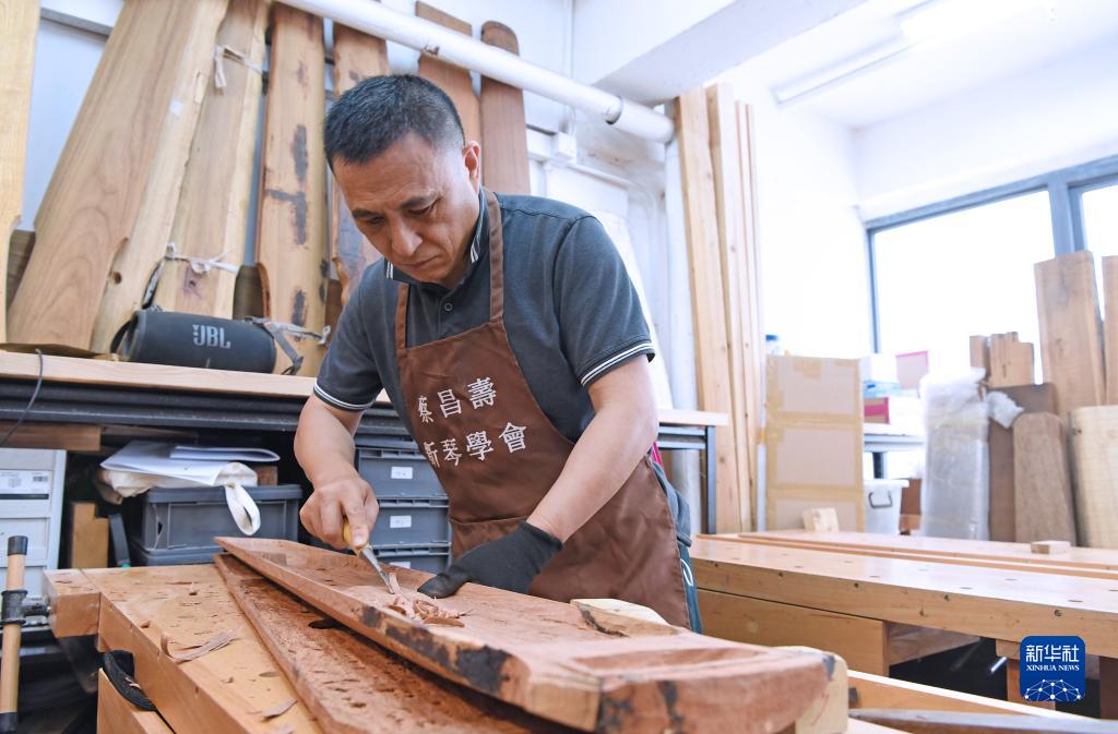 10月7日,徒弟李飛在制作古琴。 新華社記者 陳鐸 攝