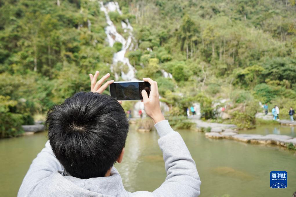 11月19日,香港筲箕灣官立中學學生在貴州荔波小七孔景區內拍照。新華社記者 駱飛 攝