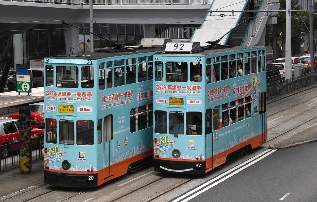 12月1日,兩輛涂有2023年區議會一般選舉宣傳廣告的電車從香港街頭駛過。新華社記者 陳鐸 攝
