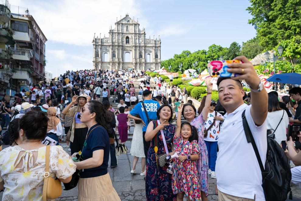 10月1日,游客在澳門大三巴牌坊前游覽。新華社記者 張金加 攝