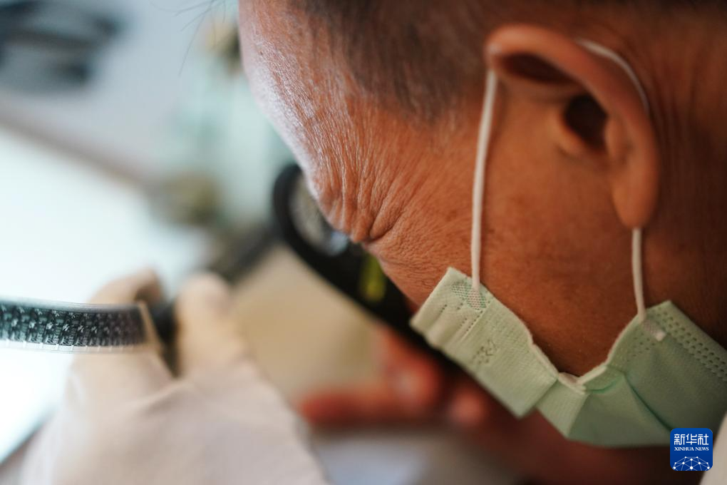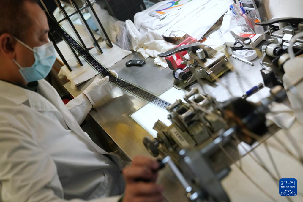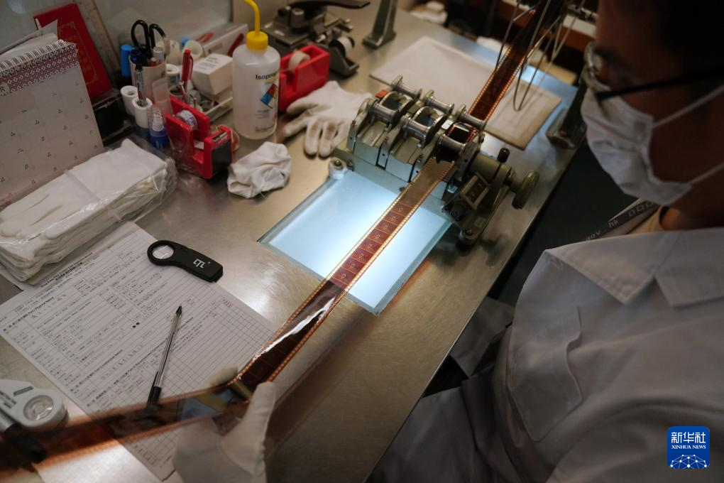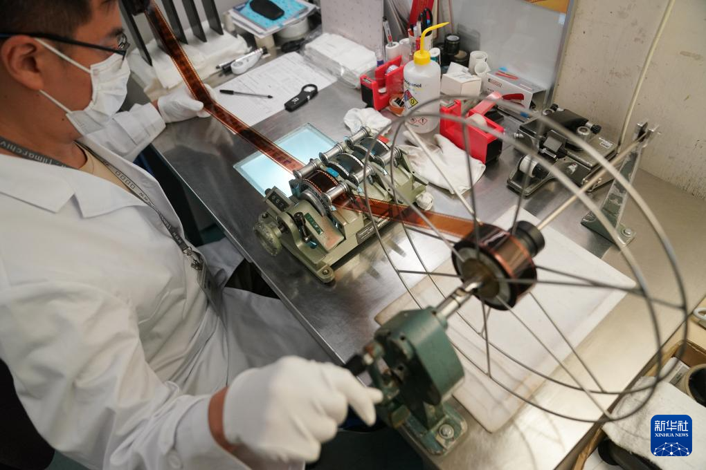 在香港電影資料館膠片修復室,膠片修補師身著白大褂、戴上手套逐一為膠片“診斷”(2023年12月13日攝)。新華社記者 王申 攝