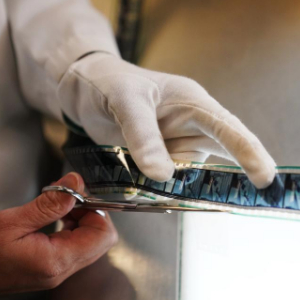 在膠片修復室,5位膠片修補師身著白大褂、戴上手套,逐一為膠片“診斷”。他們將膠片一側固定,另一側環繞在一個圓架上,猶如一座小型摩天輪,用手快速撫摸著一段段膠片,尋找它的瑕疵與斑跡,再用代號記錄下來,為其開具“診斷書”。