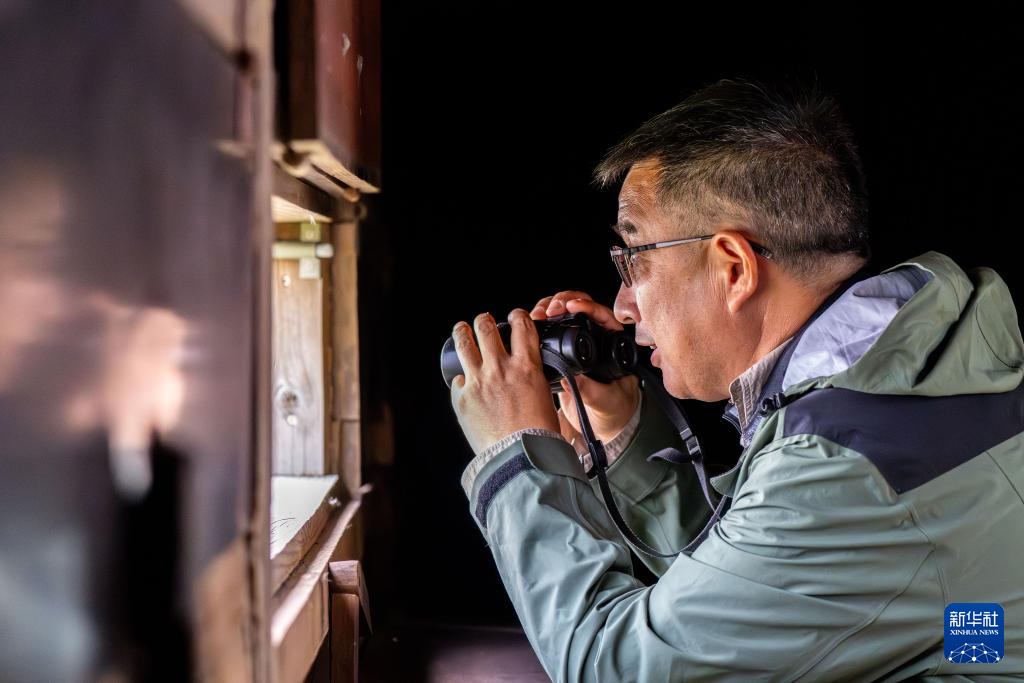1月11日,世界自然基金會香港分會米埔保護區及遷飛路線保育項目總監文賢繼在米埔自然保護區觀鳥屋觀察鳥類。新華社記者 朱煒 攝