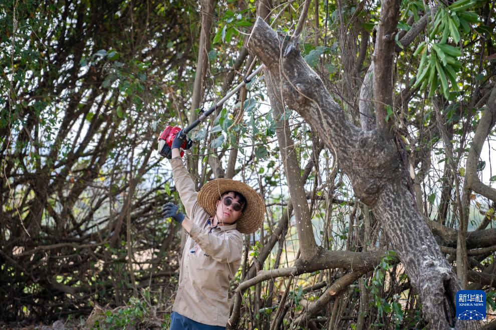 1月11日,工作人員在米埔自然保護區修剪樹枝。新華社記者 朱煒 攝