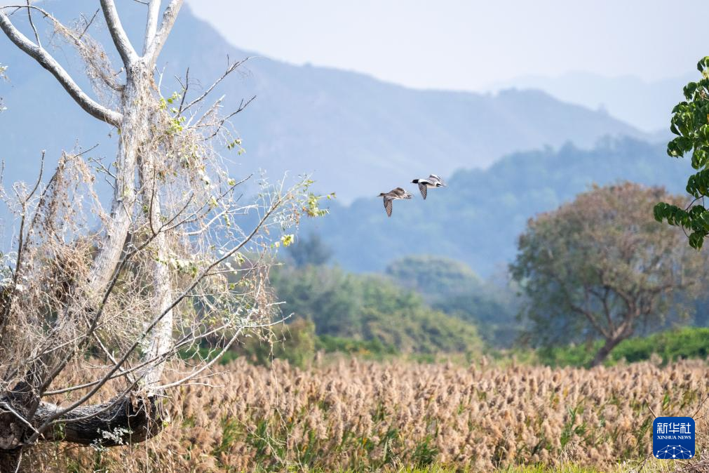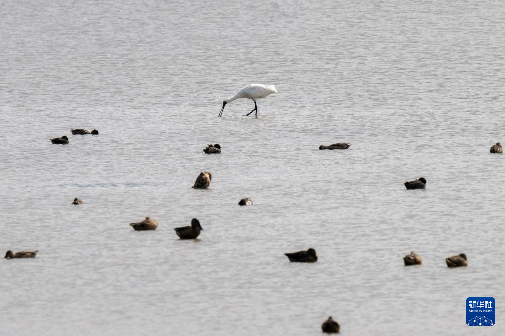 一群鸕鶿彎著脖子在高高的樹上停棲,一對白鷺舒展翅膀優雅地從半空掠過,數百只赤頸鴨在水塘里嬉戲游弋,幾只黑臉琵鷺涉水行走,不時將扁嘴扎入水中覓食。
