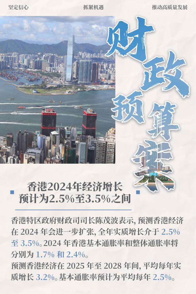 該財政預算案主題為:堅定信心、抓緊機遇、推動高質量發展。預算案顯示,香港經濟在2024年會進一步擴張,全年實質增長預計介于2.5%至3.5%,基本通脹率和整體通脹率預計分別為1.7%和2.4%。